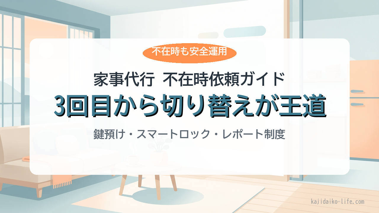 家事代行の本当の価値は、仕事中・外出中に家が整う不在時運用にあります。初回・2回目は在宅で信頼を築き、3回目から不在時に切り替える。鍵預けかスマートロックのどちらかを整え、詳細レポート制度のあるサービスを選ぶ——これで不在時依頼のリスクは最小化できます。