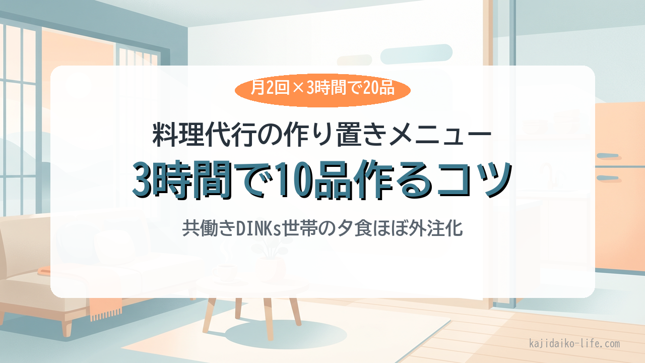 料理代行で作り置きを頼むなら、月2回×3時間で合計20品=月額12,000〜18,000円が共働きDINKs世帯の最適ラインです。外食を月5回→月1回に減らせば実質追加コストはほぼゼロで、平日夜の時間が大幅に増えます。