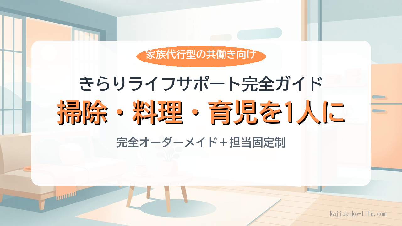 「掃除だけじゃなくて料理・ペット・子どもの見守りまで、家の事情に合わせて柔軟に頼める家事代行はないの?」——完全オーダーメイド型の「きらりライフサポート」は、この要望に応えるために設計された家事代行サービスです。結論は「同じ人が継続して家族事情を把握した上で、掃除も料理もペットも1人に任せられる」共働き家庭に最適な選択肢になります。